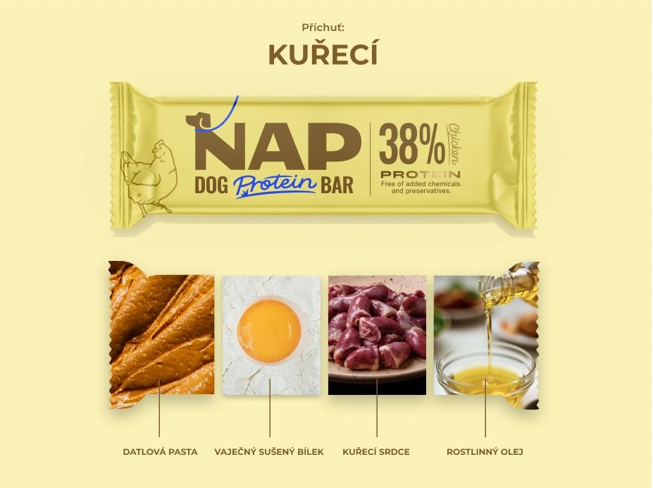 NAP DOG PROTEIN BAR – ein nahrhafter, praktischer Riegel, der speziell für Hunde entwickelt wurde. Er enthält einen hohen Anteil hochwertiger Proteine, Vitamine und Mineralstoffe – ohne unnötige Konservierungsstoffe oder Stabilisatoren. 100 % natürliche Zutaten. Geeignet für aktive Hunde, die nach dem Sport Energie auftanken müssen, ebenso wie für Familienhunde als gesunder Snack auf Spaziergängen oder Ausflügen.