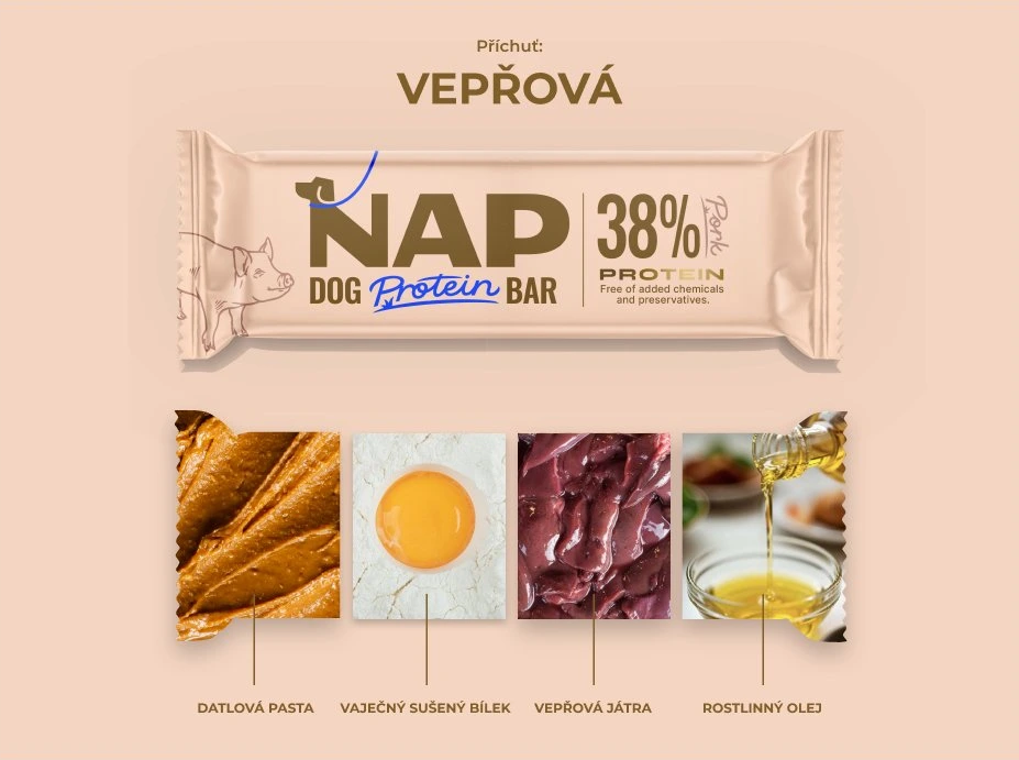 NAP DOG PROTEIN BAR – ein nahrhafter, praktischer Riegel, der speziell für Hunde entwickelt wurde. Er enthält einen hohen Anteil hochwertiger Proteine, Vitamine und Mineralstoffe – ohne unnötige Konservierungsstoffe oder Stabilisatoren. 100 % natürliche Zutaten. Geeignet für aktive Hunde, die nach dem Sport Energie auftanken müssen, ebenso wie für Familienhunde als gesunder Snack auf Spaziergängen oder Ausflügen.